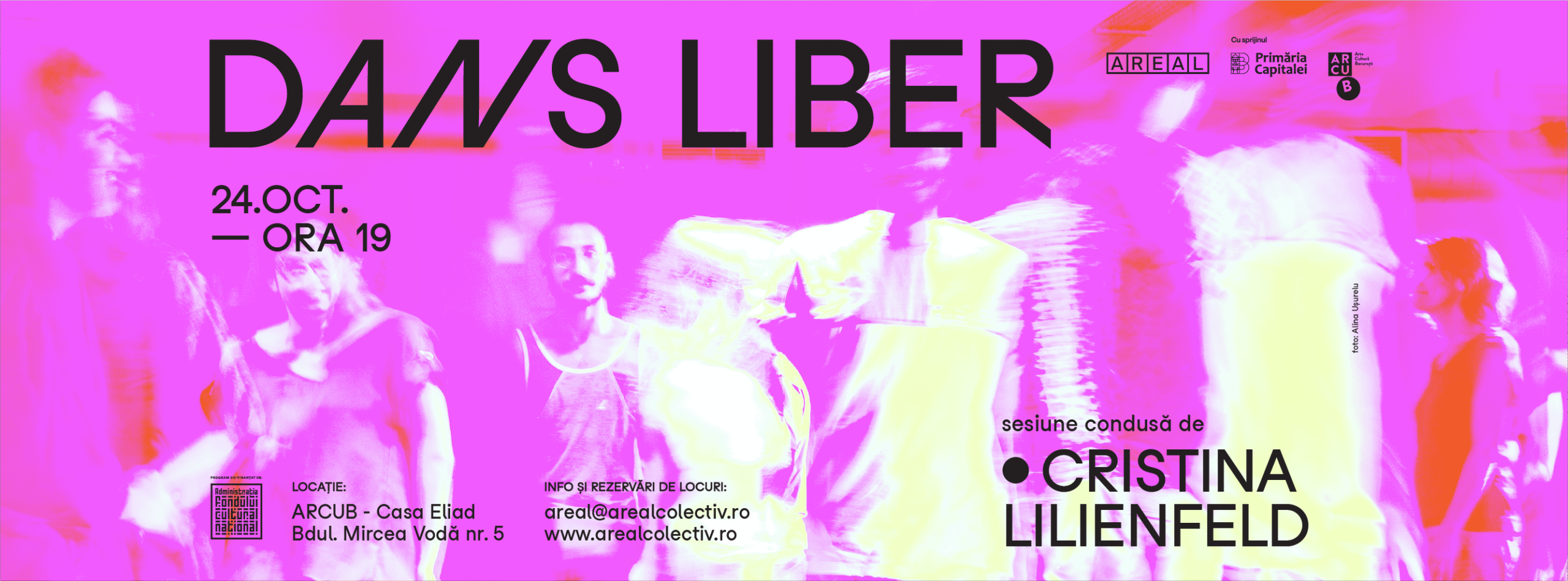 În luna octombrie, artiștii AREAL vă invită să vă mișcați liber într-o serie de două sesiuni de Dans Liber celebrând corpul, infinitatea potențialului său creativ și frumusețea vieții. Sesiunile de Dans Liber vor fi conduse de Alexandra Bălășoiu – 3 octombrie și Cristina Lilienfeld – 24 octombrie.